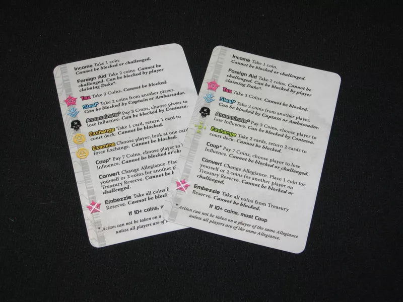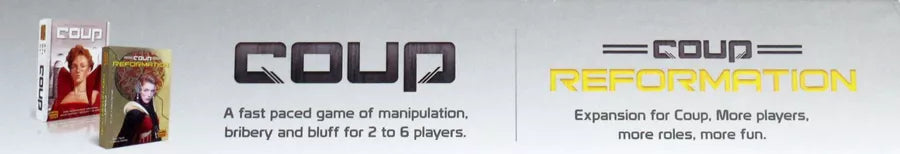 Coup: Reformation, is an expansion for the original version of Coup. It adds new cards to the game and rules for factions and team play. This increases tension in the early stages for four or more players, and 15 additional character cards allows Coup to be better played with up to ten players.